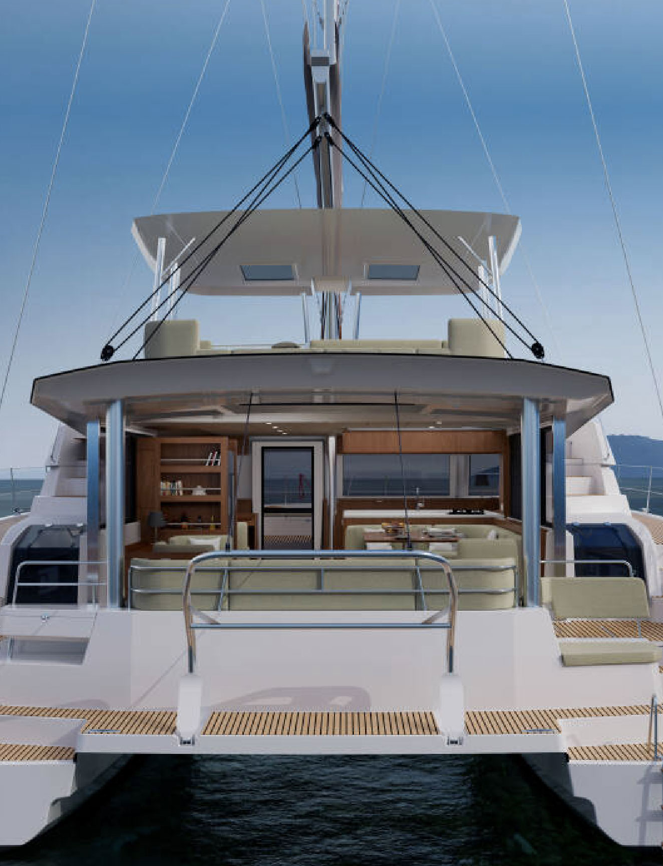 Il Bali 4.4, dal look raffinato e moderno, offre un ampio pozzetto rigido a prua con area lounge e prendisole, una piattaforma a poppa che collega gli scafi con una panca spaziosa e gavoni, oltre alla celebre porta basculante “BALI”. I suoi punti di forza sono l‘open space unico nel suo genere e il flybridge panoramico con zona relax.