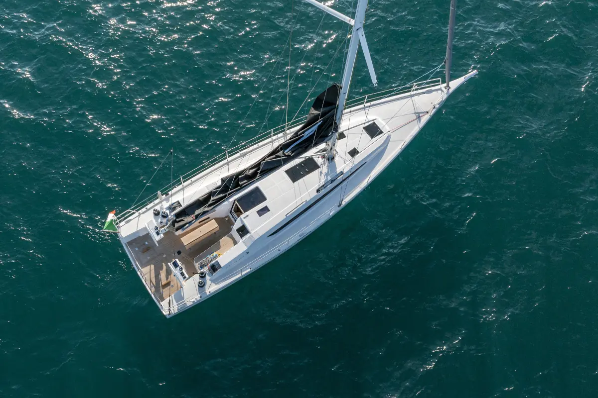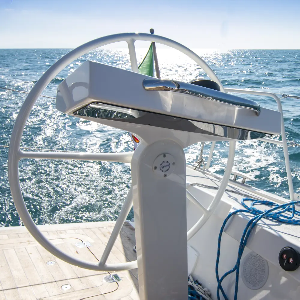 Doppia timoneria, delfiniera integrata e pozzetto in teak per un mix perfetto tra stile e praticità.