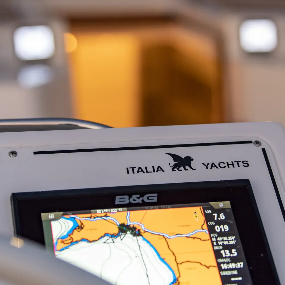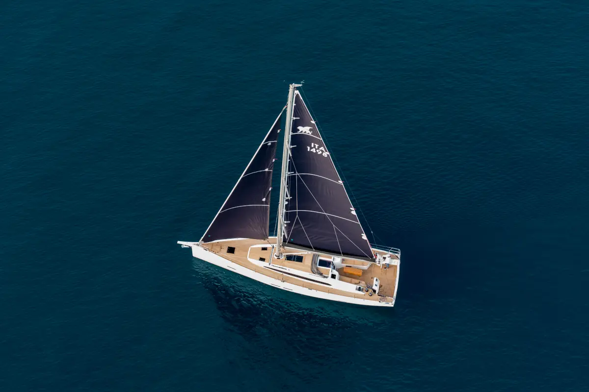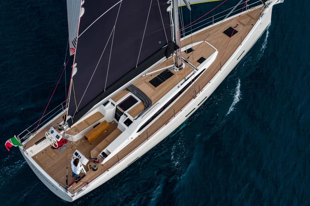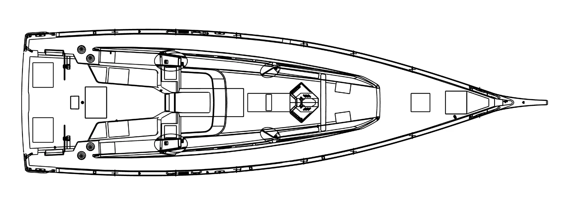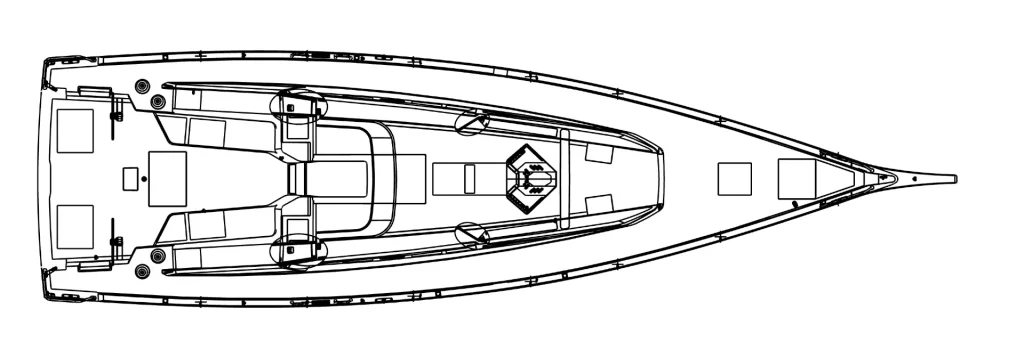 Scafo e coperta sono realizzati in sandwich con fibre di vetro biassiali e unidirezionali, resina vinilestere e rinforzi in carbonio, per leggerezza e rigidità ottimali.
