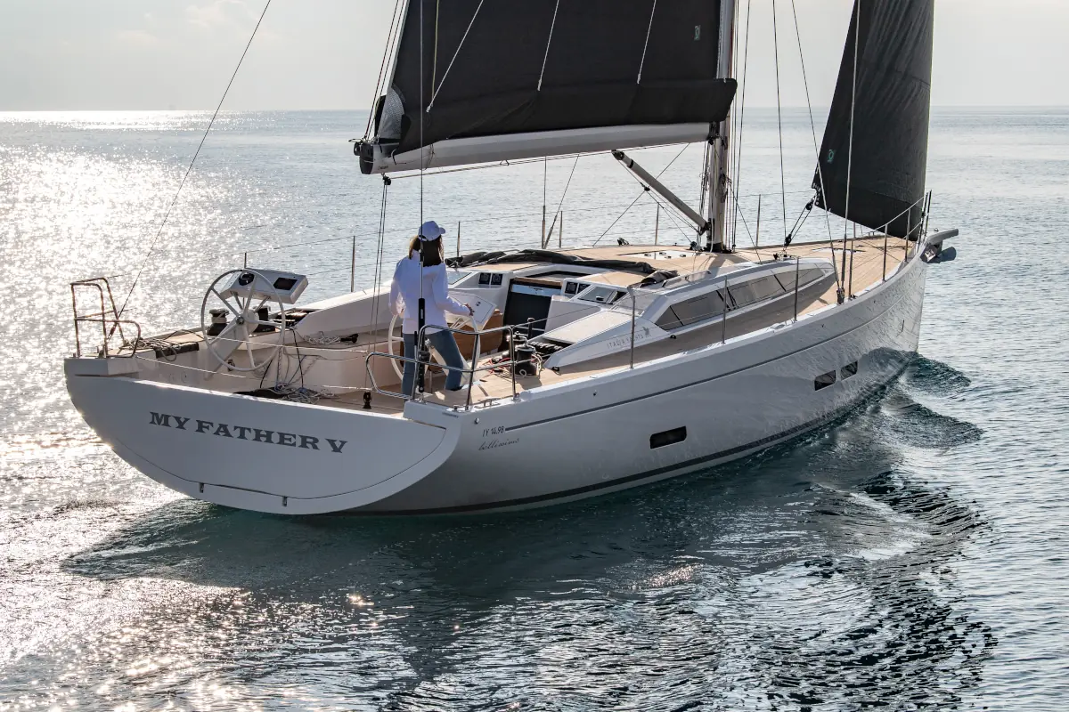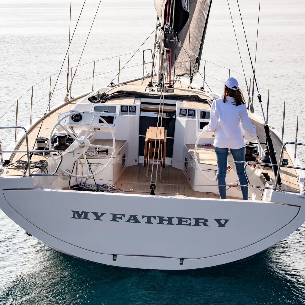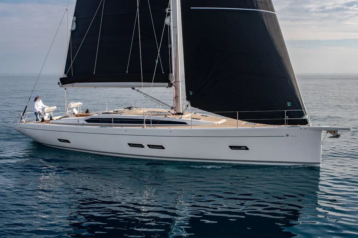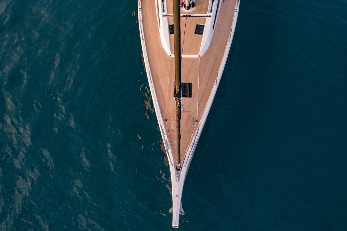 Scafo e coperta sono realizzati in sandwich con fibre di vetro biassiali e unidirezionali, resina vinilestere e rinforzi in carbonio, per leggerezza e rigidità ottimali.