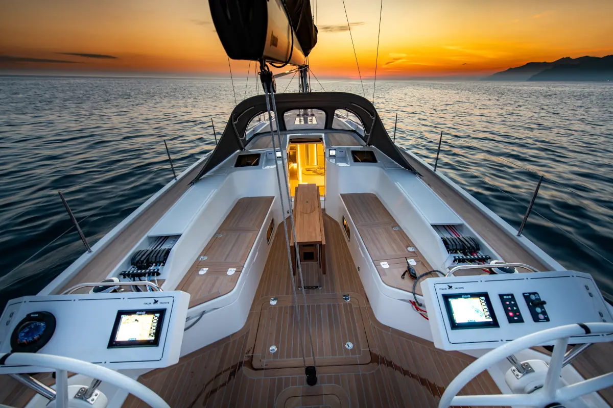 La doppia ruota del timone sostituisce la barra, la prua è allungata dalla delfiniera integrata, mentre il pozzetto in teak valorizza il design.