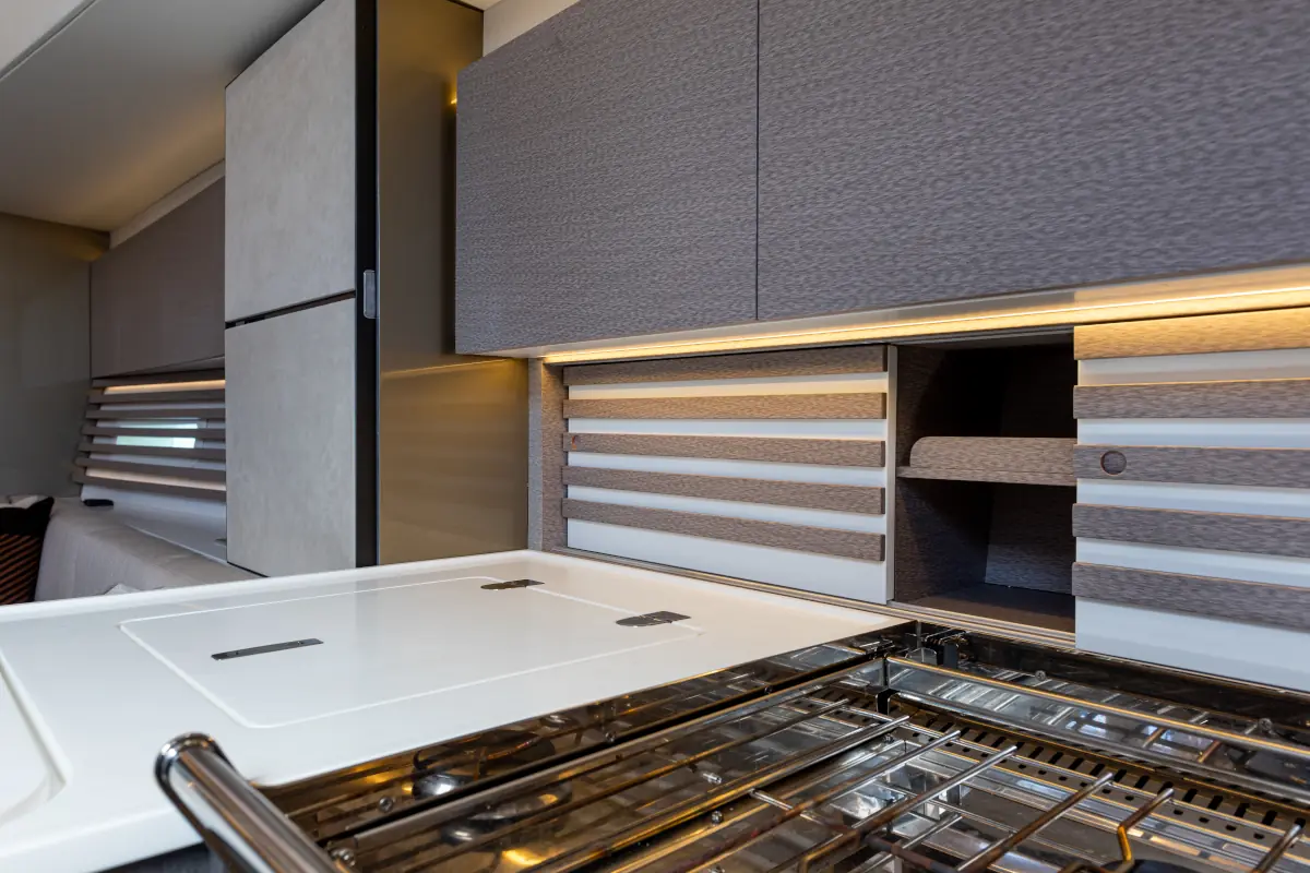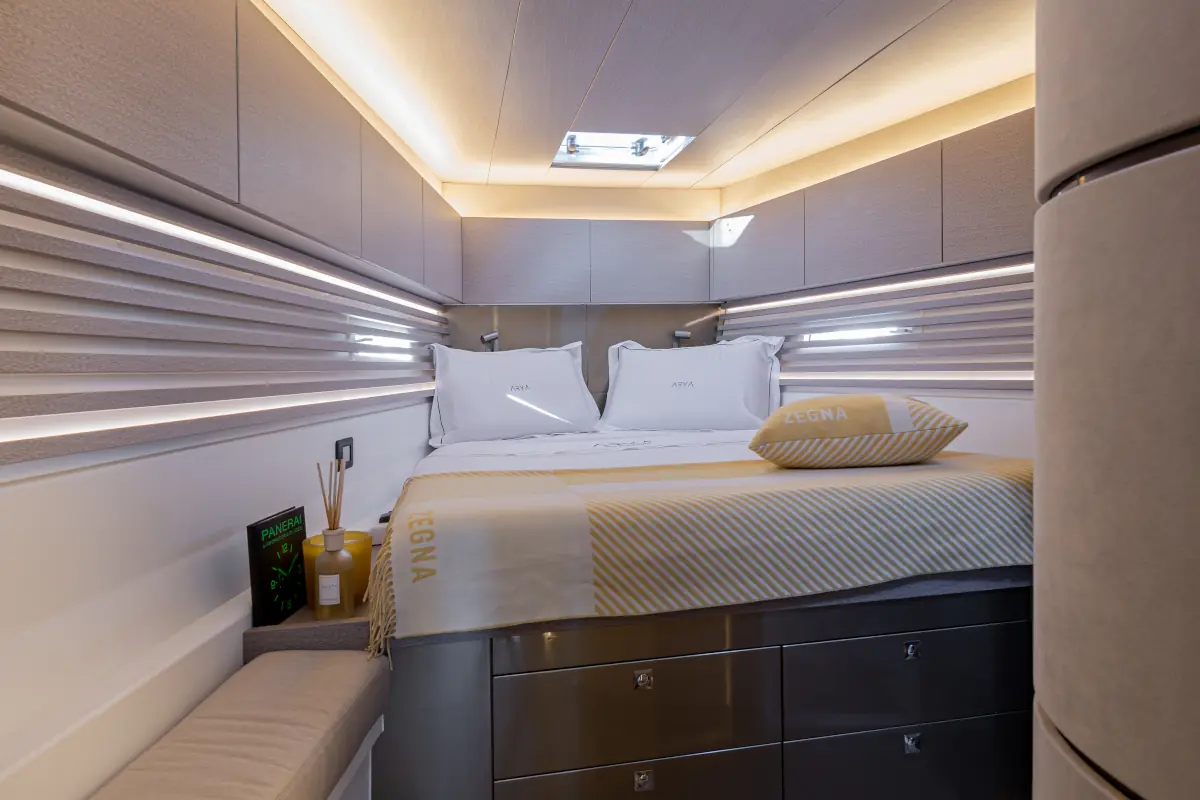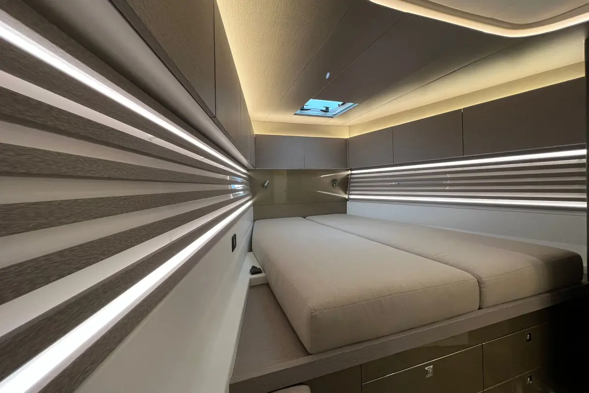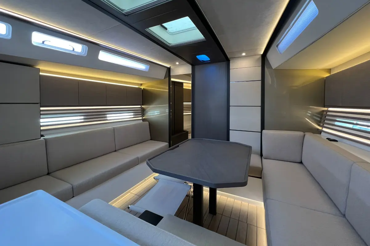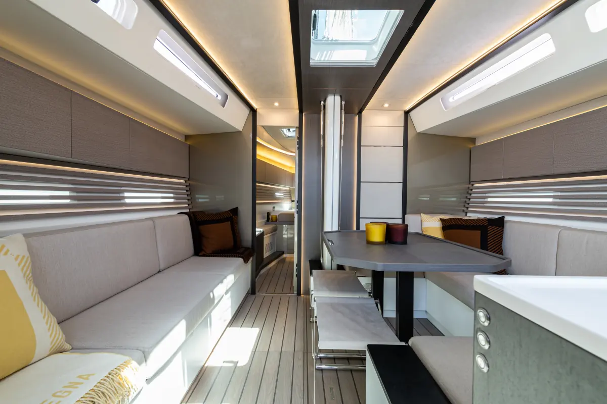 Tre configurazioni disponibili con due o tre bagni e ampi spazi di stivaggio. Il quadrato, nella versione standard, ha un grande tavolo con divano a U e una seconda seduta. Lo stile è moderno e lineare, con giochi di contrasti fra superfici opache e lucide che valorizzano i volumi e la luce.