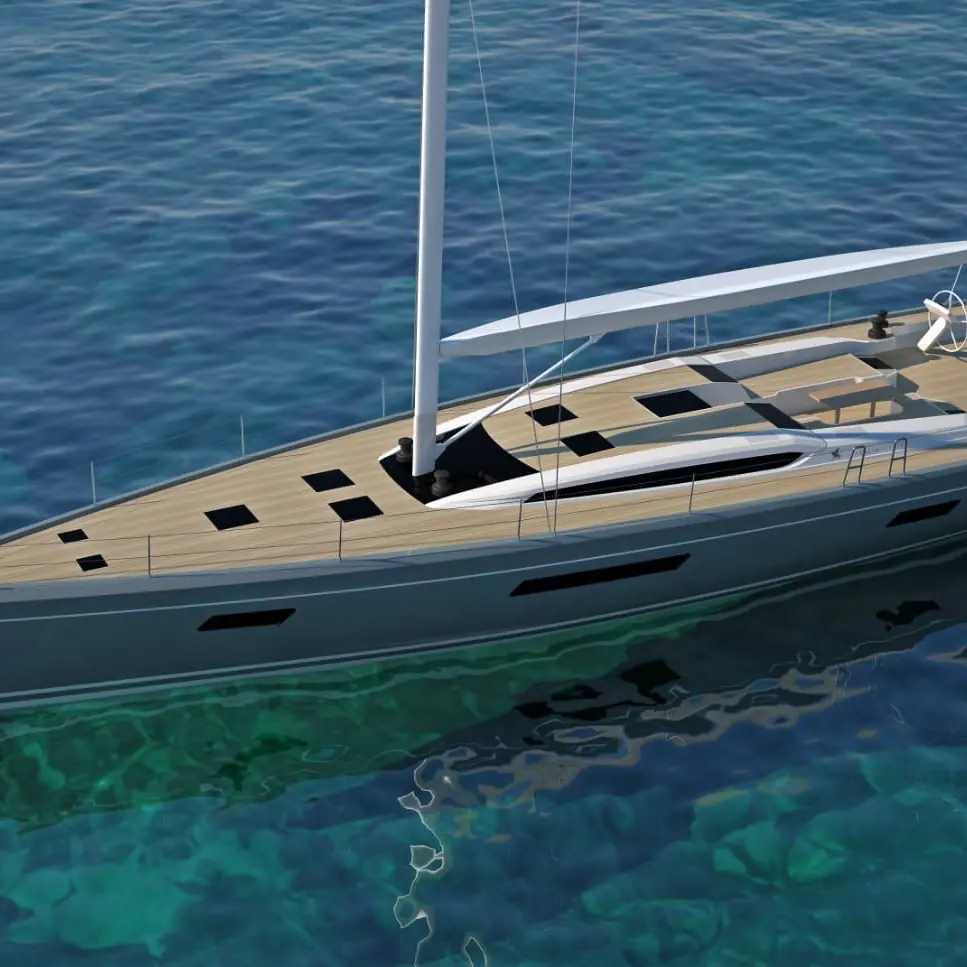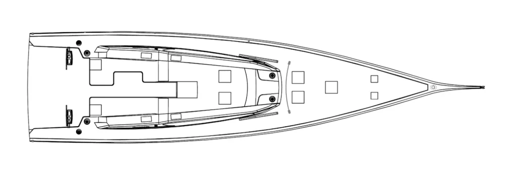 Il layout della coperta richiama quello dei maxi yacht, con tre aree distinte nel pozzetto, ampi passavanti liberi e molte zone dedicate al relax. I winch per le vele di prua e la randa sono dimensionati per ridurre al massimo la fatica e predisposti per l’elettrificazione.