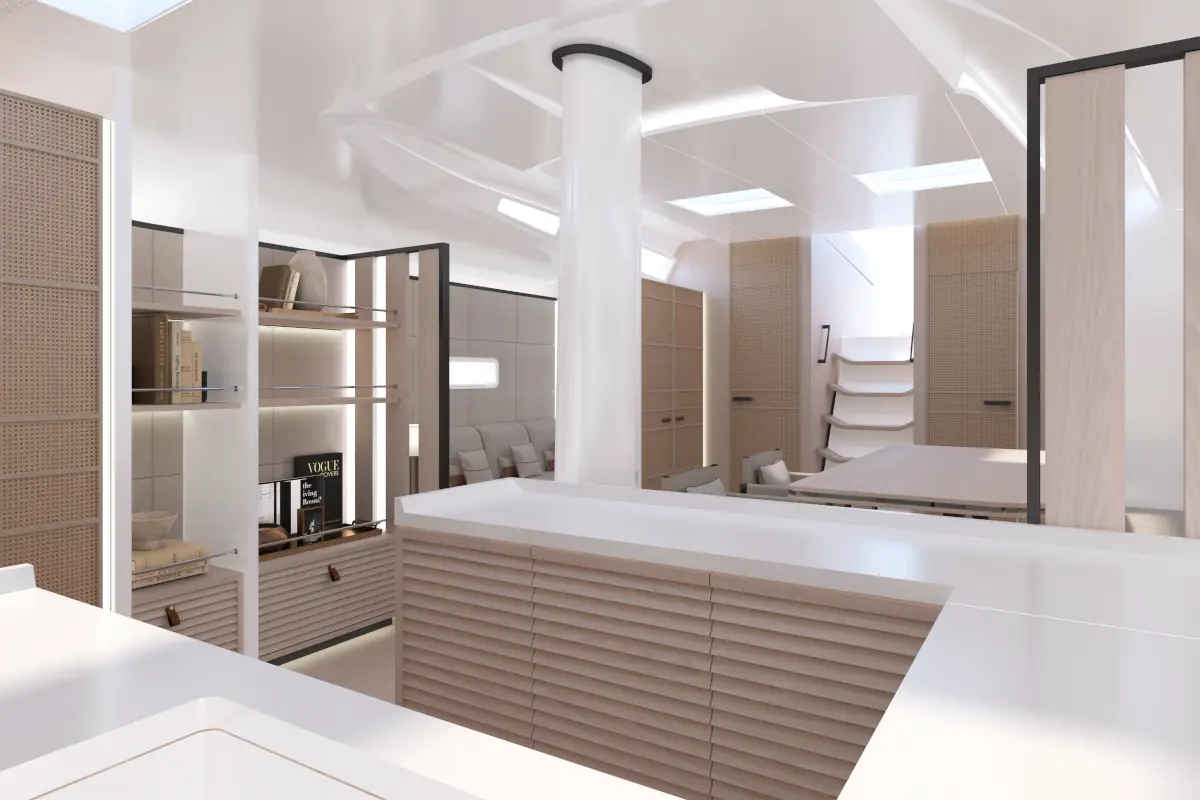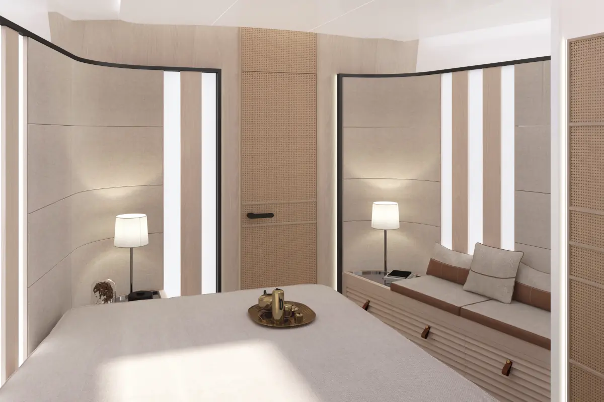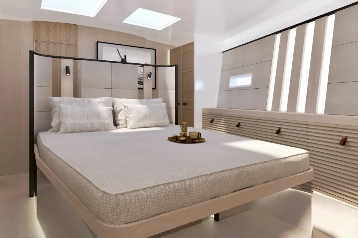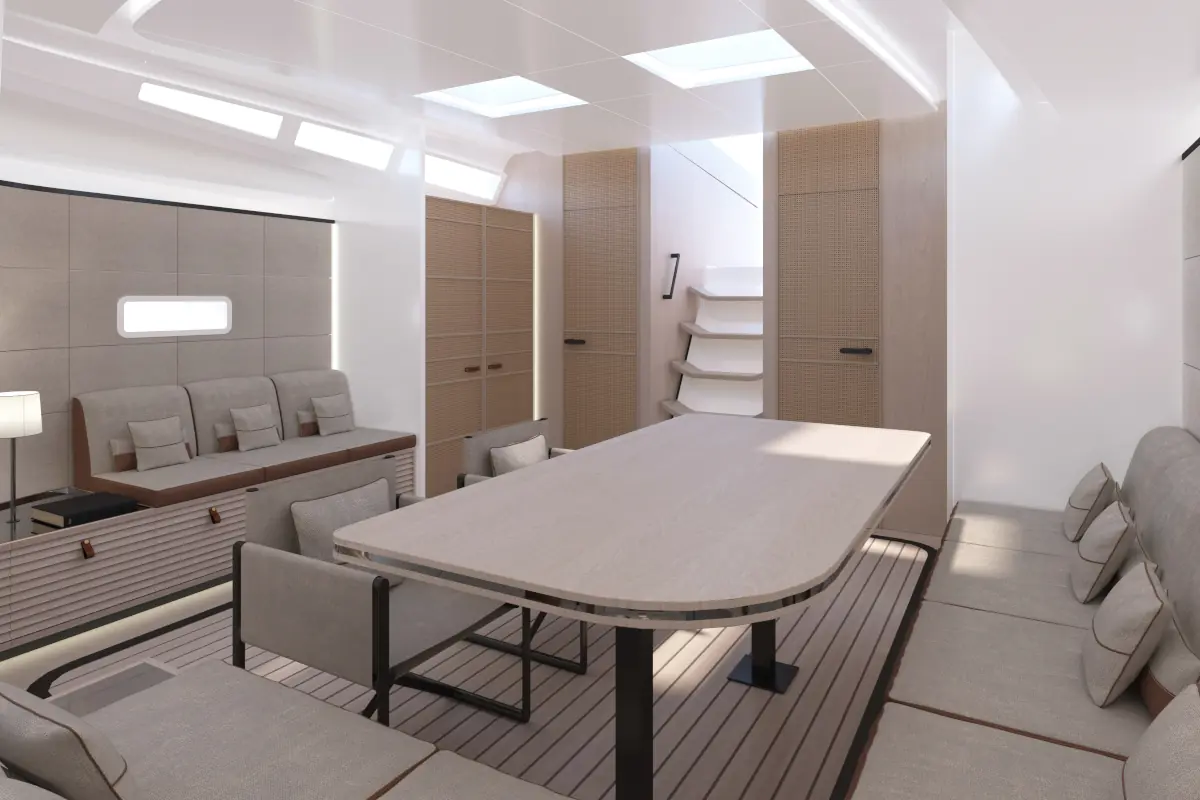 Sono disponibili layout personalizzabili, tra cui una zona cucina-living di ispirazione superyacht e un’area equipaggio indipendente a poppa.