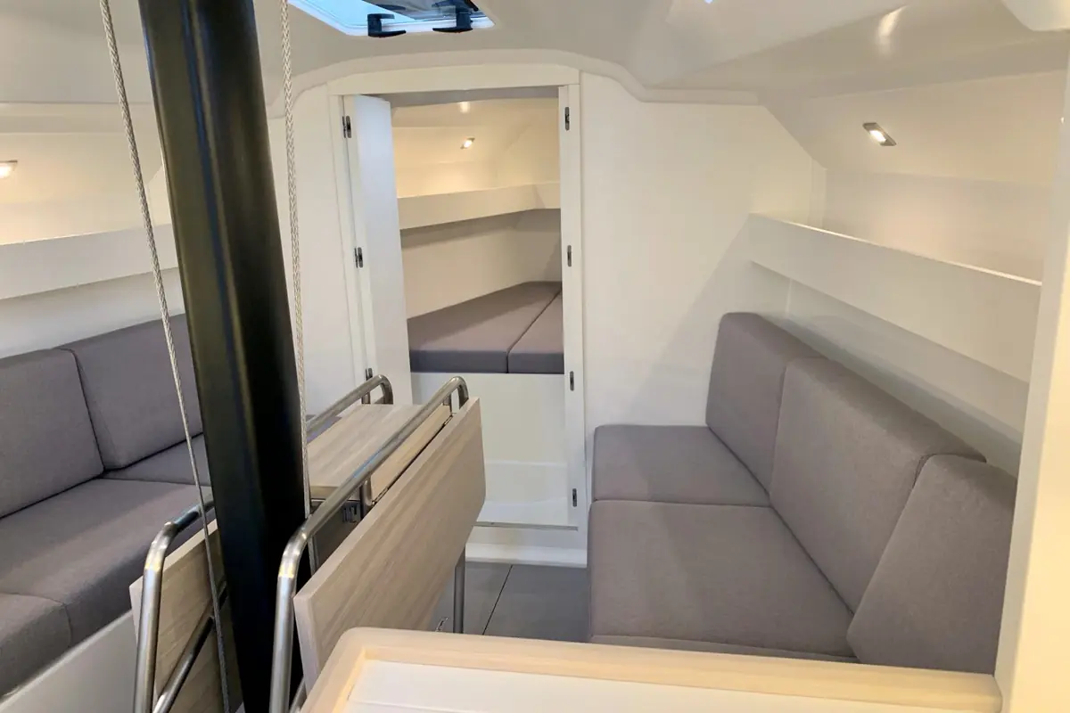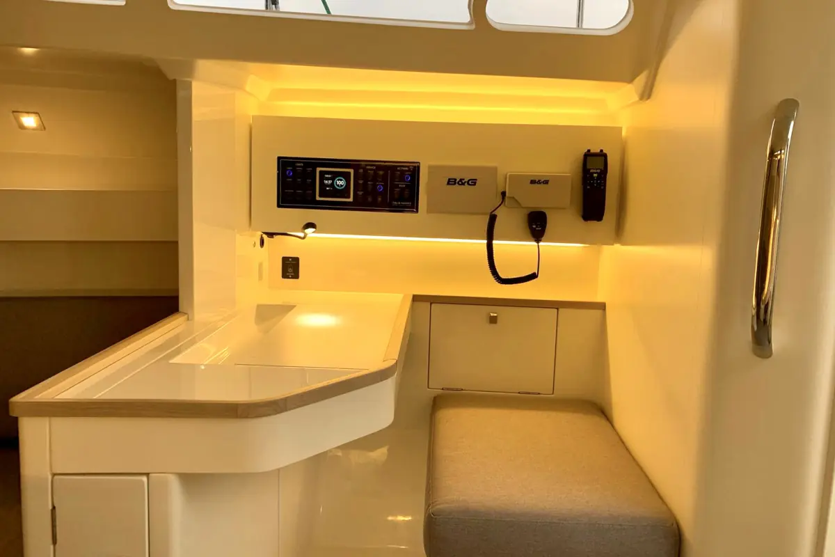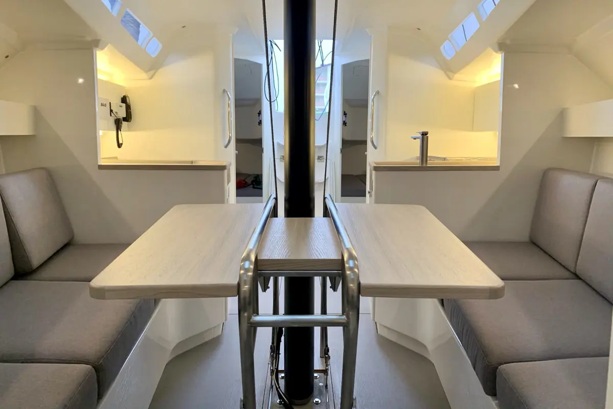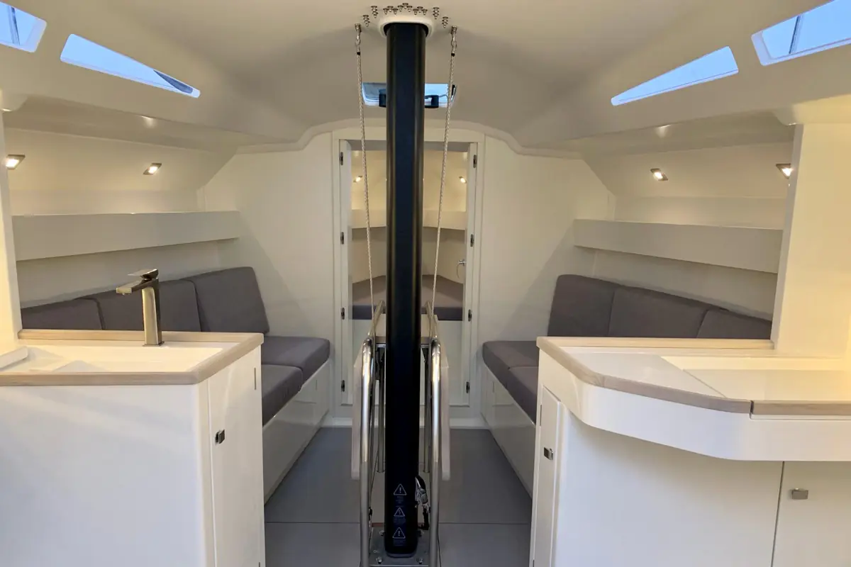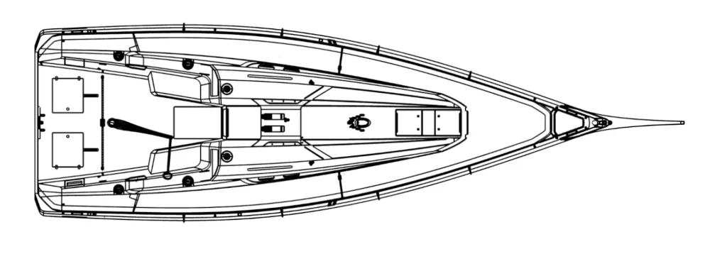 Gli spazi esterni sono ampi e vivibili, in perfetta continuità con interni simmetrici e razionali. Tre cabine, due bagni e un design pulito rendono ogni crociera confortevole e funzionale.