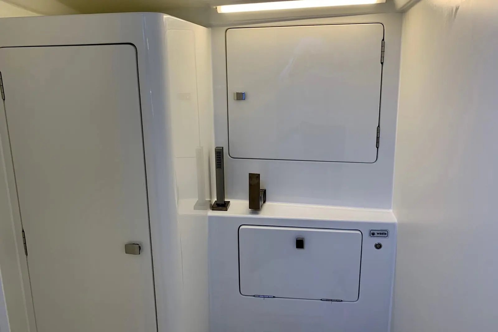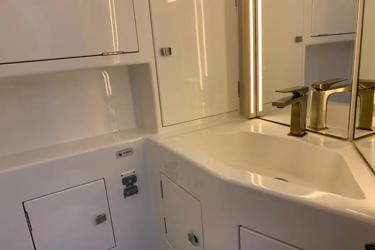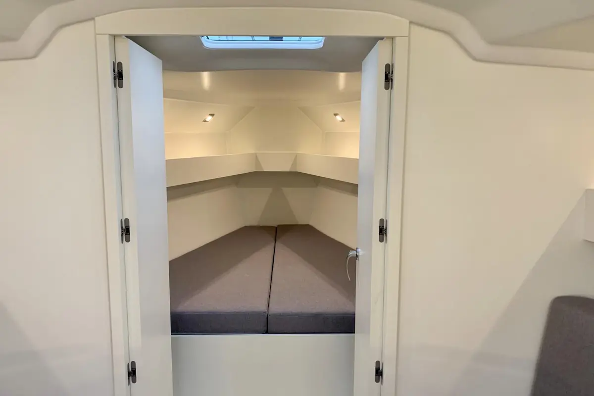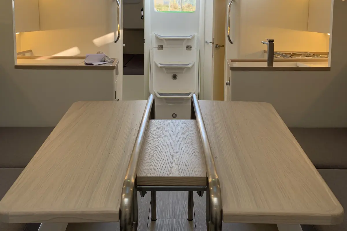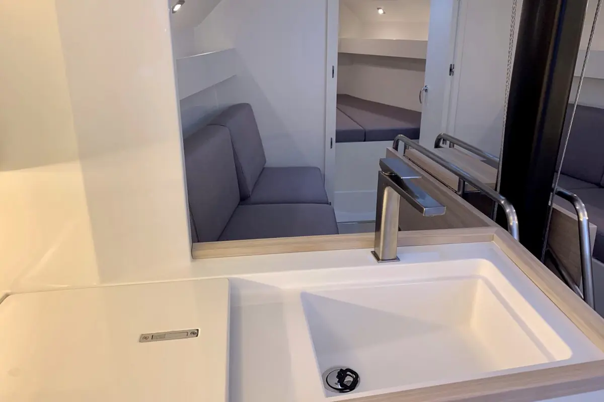 Gli spazi esterni sono ampi e vivibili, in perfetta continuità con interni simmetrici e razionali. Tre cabine, due bagni e un design pulito rendono ogni crociera confortevole e funzionale.