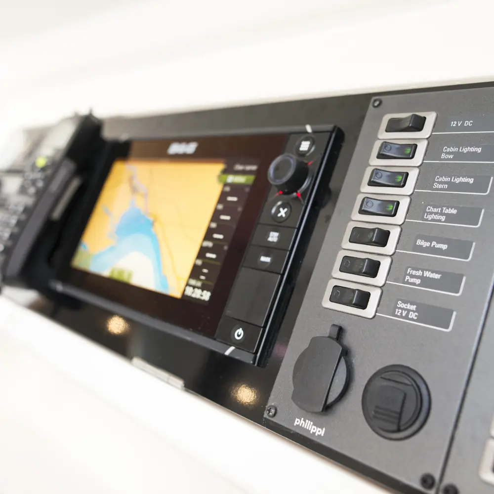 Scafo e coperta sono in sandwich con tessuti di vetro biassiali e unidirezionali, resina vinilestere e rinforzi in carbonio, per garantire leggerezza e rigidità strutturale.