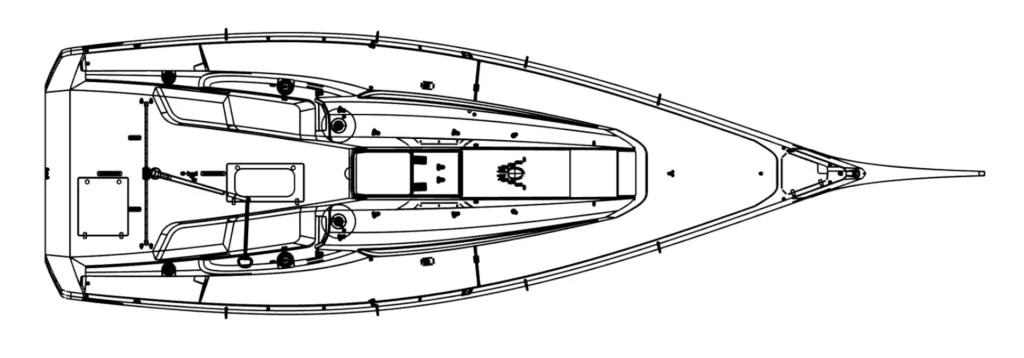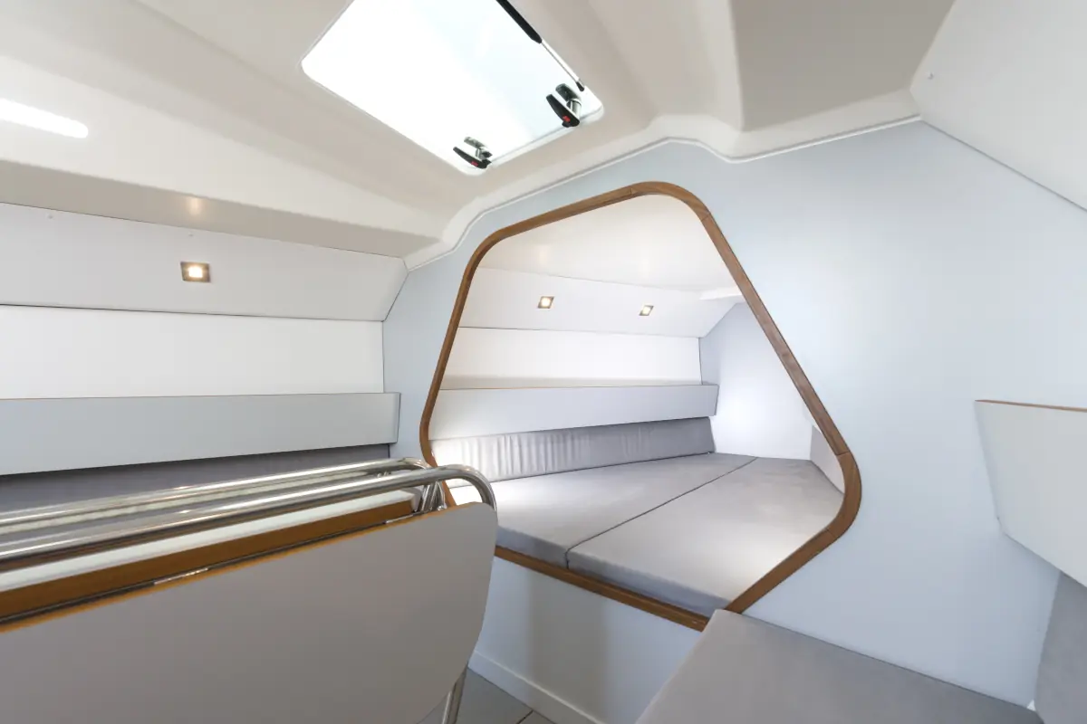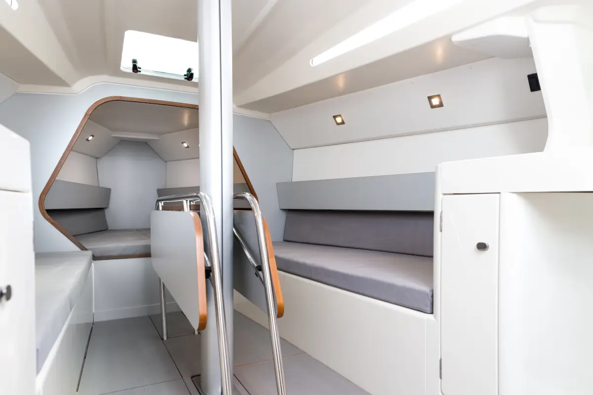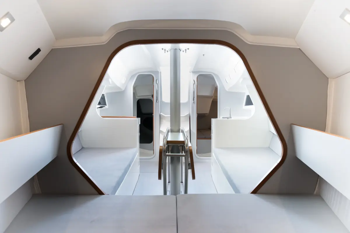 L’IY 9.98 è pensato anche per navigazioni più lunghe: due cabine, bagno a poppa, cucina e zona carteggio convivono in un layout raffinato e funzionale. Alcuni elementi sono rimovibili per ridurre il dislocamento in regata.