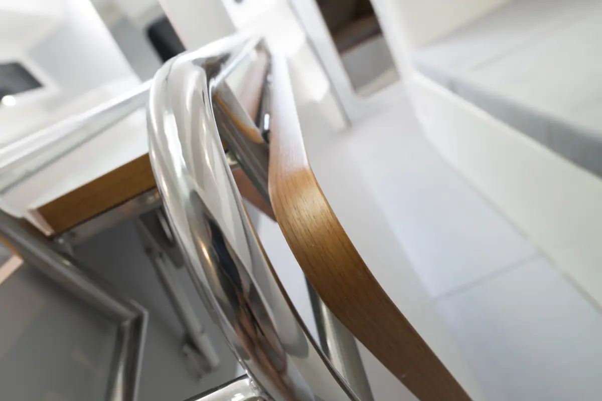 Doppia ruota al timone, delfiniera integrata e teak in pozzetto coniugano funzionalità e design.